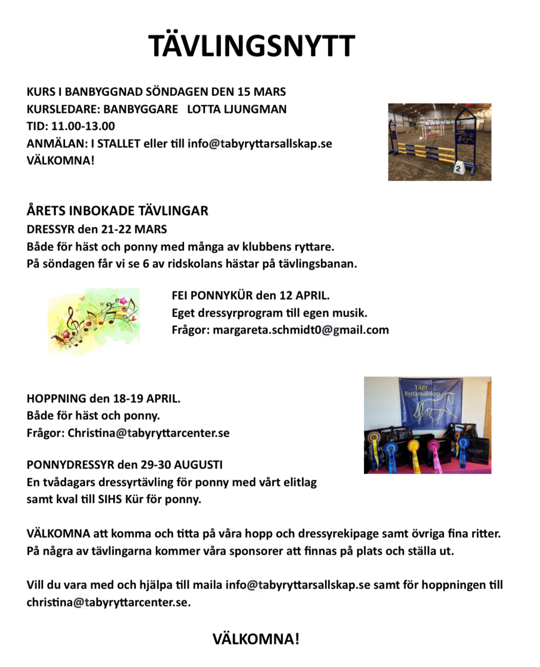 Den 21-22 mars anordnar ridklubben en dressyrtävling. Vi har klasser både för ponny och häst båda dagarna. På lördagen börjar tävlingen 15.30 och på söndagen börjar tävlingen 08.00. Vill du hjälpa oss som funktionär? Isåfall är du varmt välkommen att mejla info@tabyryttarsallskap.se (alt. info@tabyryttarcenter.se).